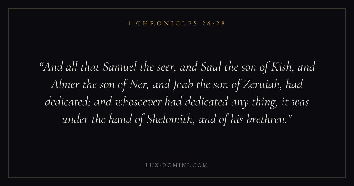 And all that Samuel the seer, and Saul the son of Kish, and Abner the son of Ner, and Joab the son of Zeruiah, had dedicated; and whosoever had dedicated any thing, it was under the hand of Shelomith, and of his brethren.