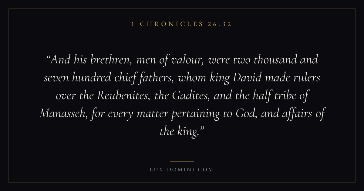 And his brethren, men of valour, were two thousand and seven hundred chief fathers, whom king David made rulers over the Reubenites, the Gadites, and the half tribe of Manasseh, for every matter pertaining to God, and affairs of the king.