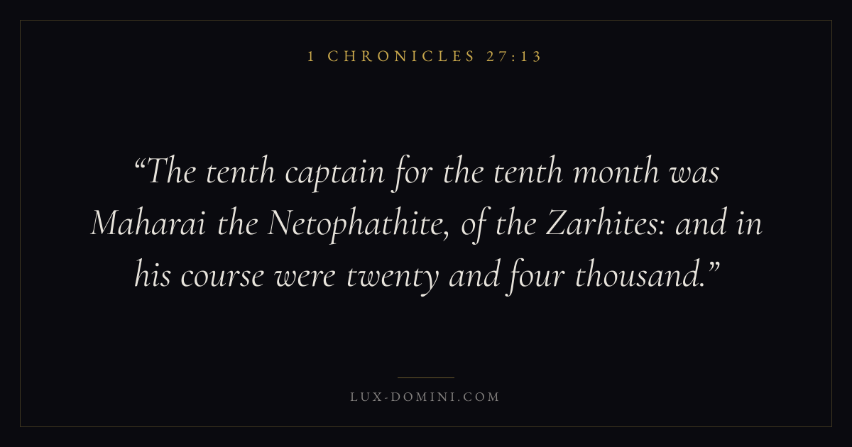 The tenth captain for the tenth month was Maharai the Netophathite, of the Zarhites: and in his course were twenty and four thousand.