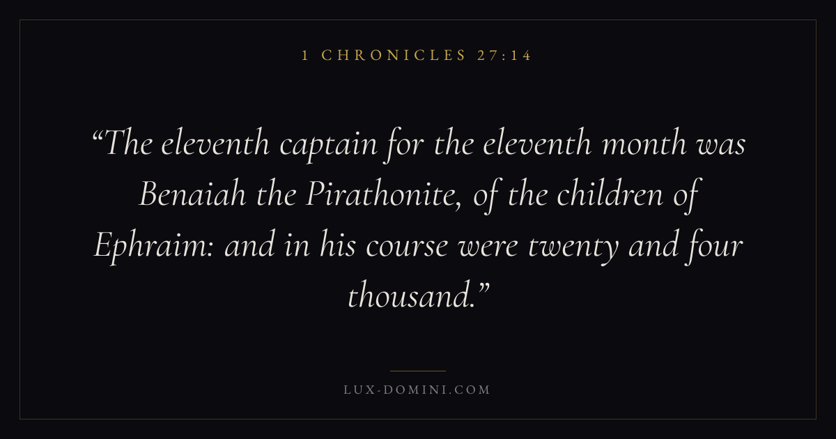 The eleventh captain for the eleventh month was Benaiah the Pirathonite, of the children of Ephraim: and in his course were twenty and four thousand.