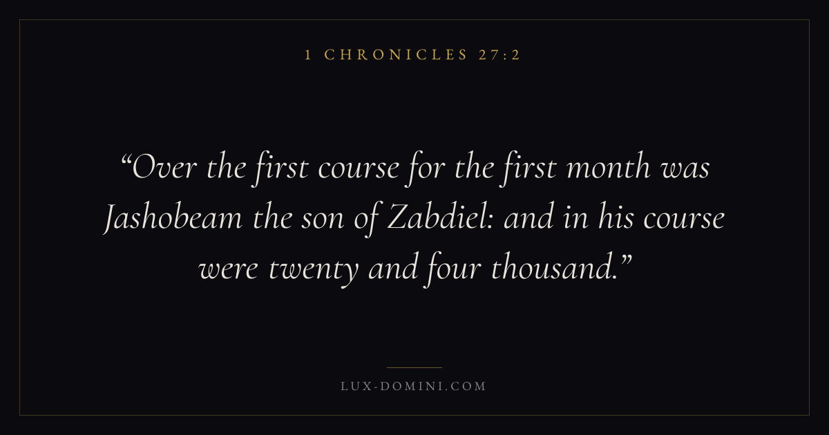 Over the first course for the first month was Jashobeam the son of Zabdiel: and in his course were twenty and four thousand.