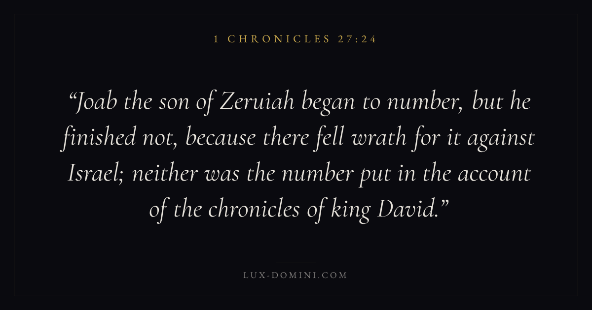 Joab the son of Zeruiah began to number, but he finished not, because there fell wrath for it against Israel; neither was the number put in the account of the chronicles of king David.