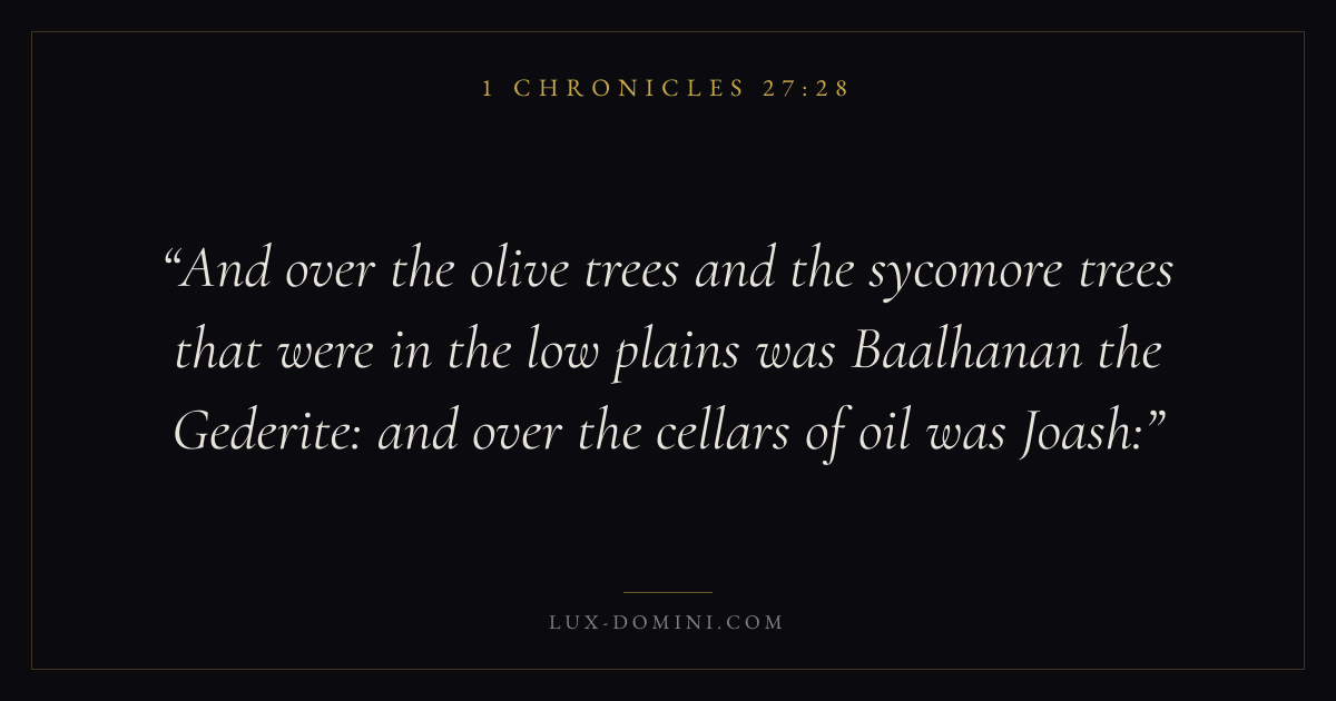 And over the olive trees and the sycomore trees that were in the low plains was Baalhanan the Gederite: and over the cellars of oil was Joash: