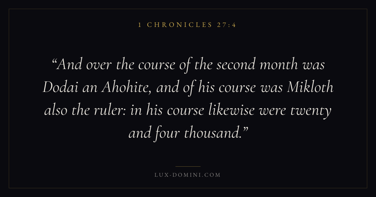 And over the course of the second month was Dodai an Ahohite, and of his course was Mikloth also the ruler: in his course likewise were twenty and four thousand.