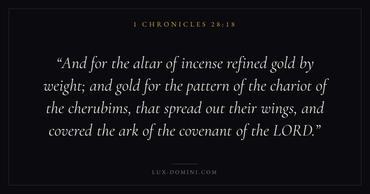 And for the altar of incense refined gold by weight; and gold for the pattern of the chariot of the cherubims, that spread out their wings, and covered the ark of the covenant of the LORD.