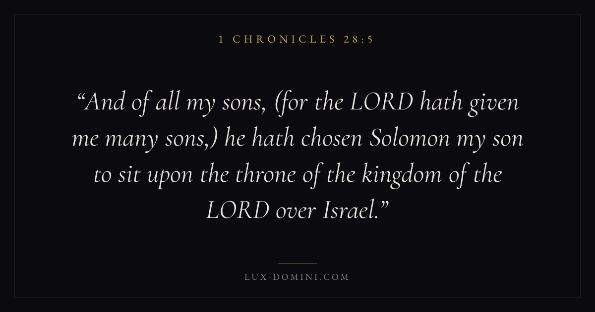 And of all my sons, (for the LORD hath given me many sons,) he hath chosen Solomon my son to sit upon the throne of the kingdom of the LORD over Israel.