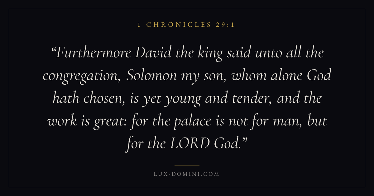 Furthermore David the king said unto all the congregation, Solomon my son, whom alone God hath chosen, is yet young and tender, and the work is great: for the palace is not for man, but for the LORD God.
