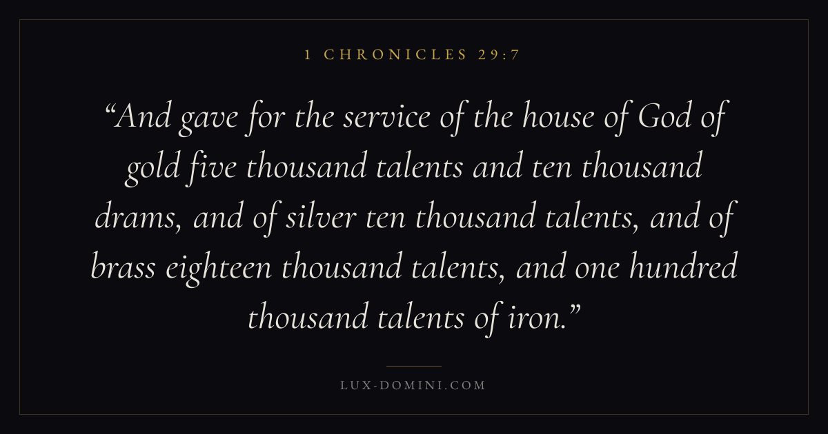 And gave for the service of the house of God of gold five thousand talents and ten thousand drams, and of silver ten thousand talents, and of brass eighteen thousand talents, and one hundred thousand talents of iron.