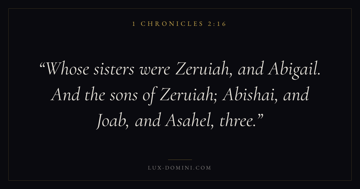 Whose sisters were Zeruiah, and Abigail. And the sons of Zeruiah; Abishai, and Joab, and Asahel, three.