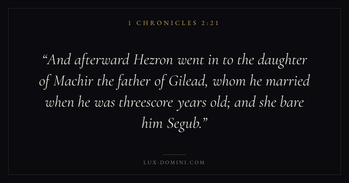 And afterward Hezron went in to the daughter of Machir the father of Gilead, whom he married when he was threescore years old; and she bare him Segub.