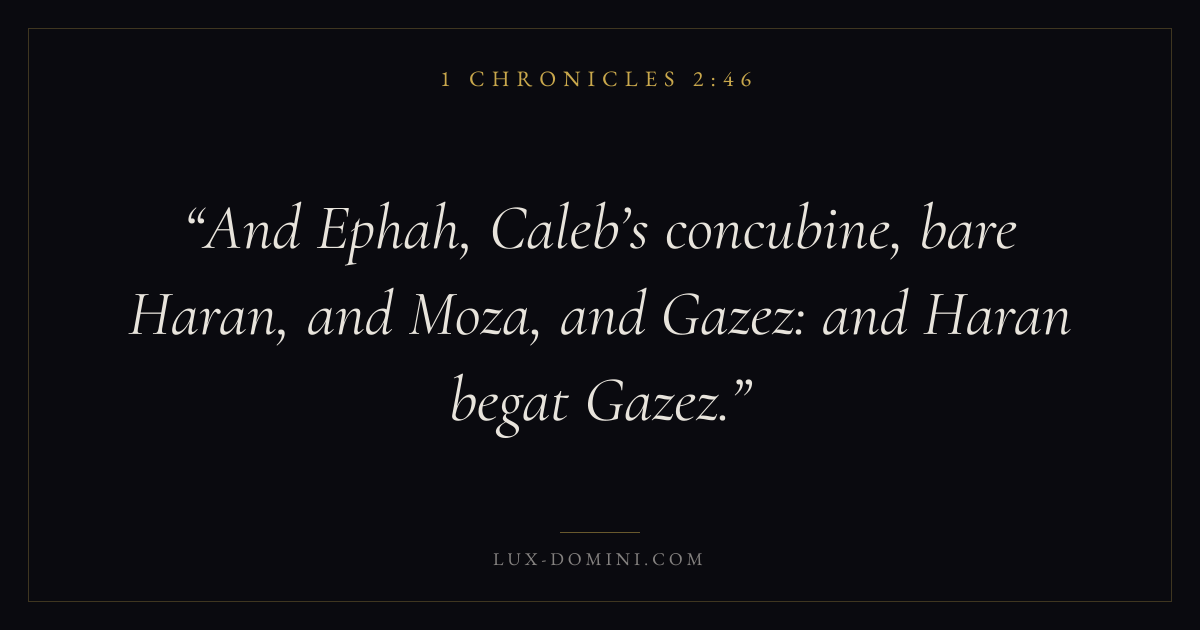 And Ephah, Caleb’s concubine, bare Haran, and Moza, and Gazez: and Haran begat Gazez.