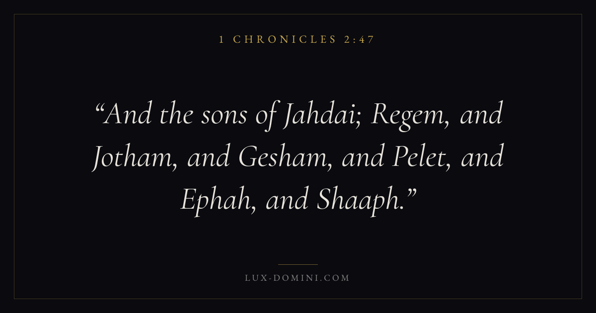 And the sons of Jahdai; Regem, and Jotham, and Gesham, and Pelet, and Ephah, and Shaaph.