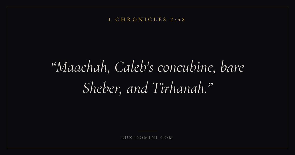 Books / 1 Chronicles / Chapter 2 / Verse 48 ← 1 Chronicles 2:47 1 Chronicles 2:48 1 Chronicles 2:49 → Maachah, Caleb’s concubine, bare Sheber, and Tirhanah. Download verse card Share on Twitter Share on Facebook Pin it ✦ Key themes MemoryWorshipGenealogyDavid Read with 1 Chronicles 2:471 Chronicles 2:49 Related topics Bible verses about worship ✦ 1 Chronicles Chapter 2 verses V. 1 V. 2 V. 3 V. 4 V. 5 V. 6 V. 7 V. 8 V. 9 V. 10 V. 11 V. 12 V. 13 V. 14 V. 15 V. 16 V. 17 V. 18 V. 19 V. 20 V. 21 V. 22 V. 23 V. 24 V. 25 V. 26 V. 27 V. 28 V. 29 V. 30 V. 31 V. 32 V. 33 V. 34 V. 35 V. 36 V. 37 V. 38 V. 39 V. 40 V. 41 V. 42 V. 43 V. 44 V. 45 V. 46 V. 47 V. 48 V. 49 V. 50 V. 51 V. 52 V. 53 V. 54 V. 55