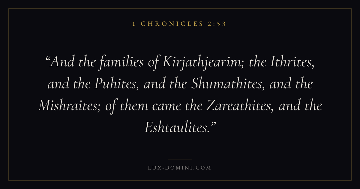 And the families of Kirjathjearim; the Ithrites, and the Puhites, and the Shumathites, and the Mishraites; of them came the Zareathites, and the Eshtaulites.