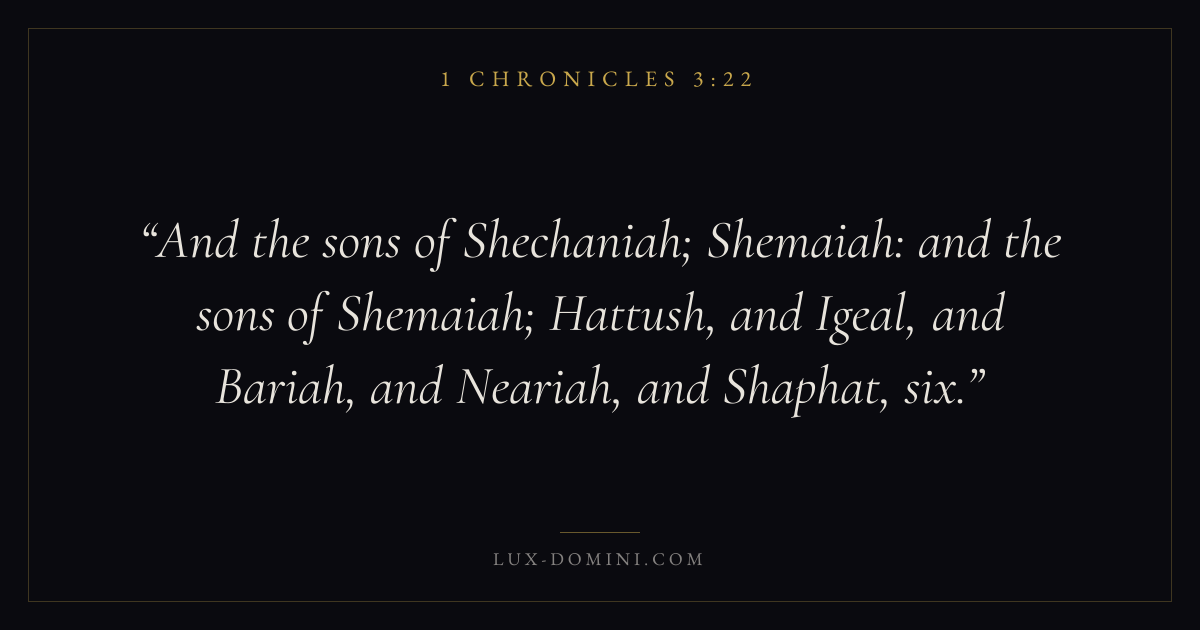 And the sons of Shechaniah; Shemaiah: and the sons of Shemaiah; Hattush, and Igeal, and Bariah, and Neariah, and Shaphat, six.