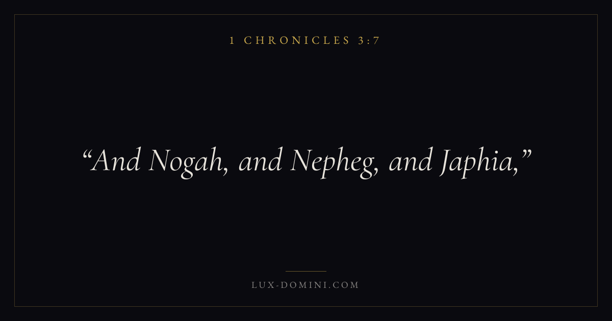 Books / 1 Chronicles / Chapter 3 / Verse 7 ← 1 Chronicles 3:6 1 Chronicles 3:7 1 Chronicles 3:8 → And Nogah, and Nepheg, and Japhia, Download verse card Share on Twitter Share on Facebook Pin it ✦ Key themes MemoryWorshipGenealogyDavid Read with 1 Chronicles 3:41 Chronicles 3:5 Related topics Bible verses about worship ✦ 1 Chronicles Chapter 3 verses V. 1 V. 2 V. 3 V. 4 V. 5 V. 6 V. 7 V. 8 V. 9 V. 10 V. 11 V. 12 V. 13 V. 14 V. 15 V. 16 V. 17 V. 18 V. 19 V. 20 V. 21 V. 22 V. 23 V. 24