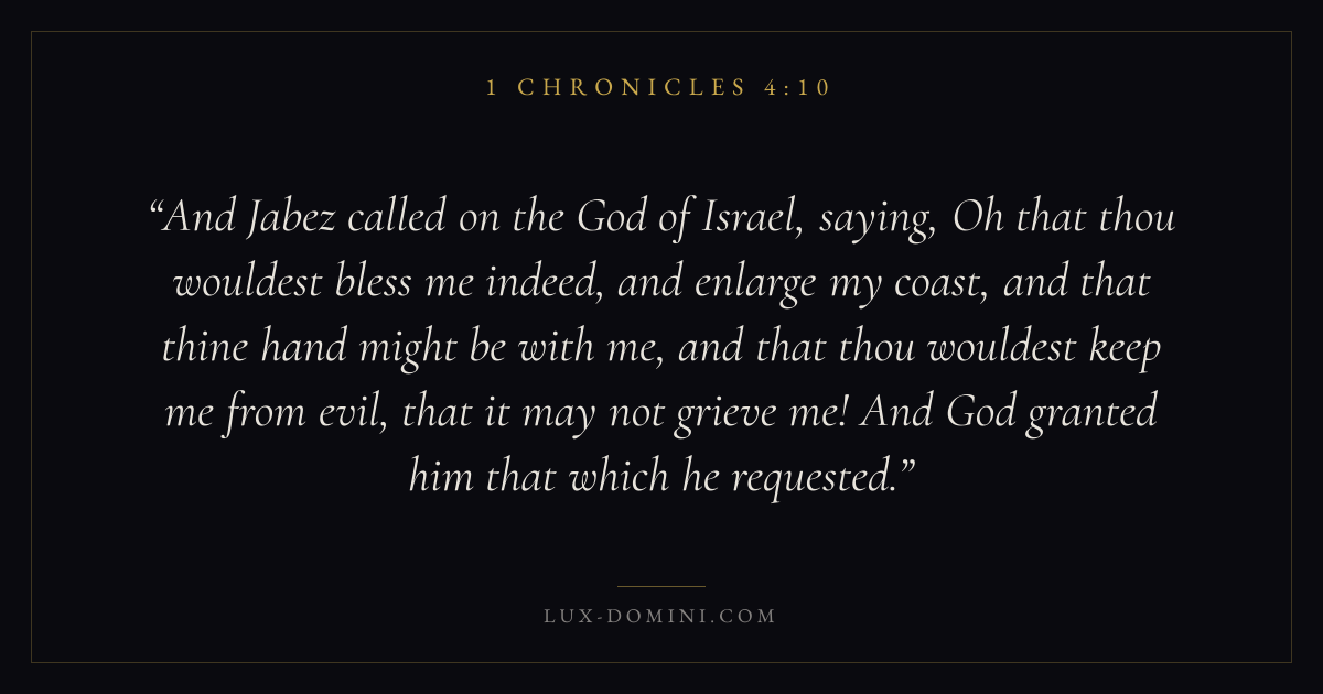And Jabez called on the God of Israel, saying, Oh that thou wouldest bless me indeed, and enlarge my coast, and that thine hand might be with me, and that thou wouldest keep me from evil, that it may not grieve me! And God granted him that which he requested.