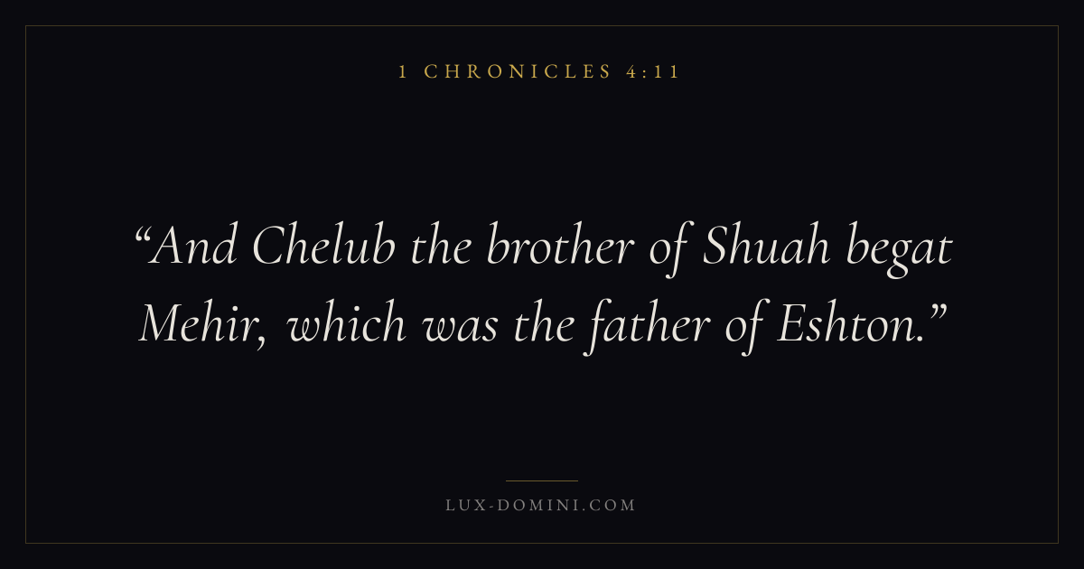 And Chelub the brother of Shuah begat Mehir, which was the father of Eshton.