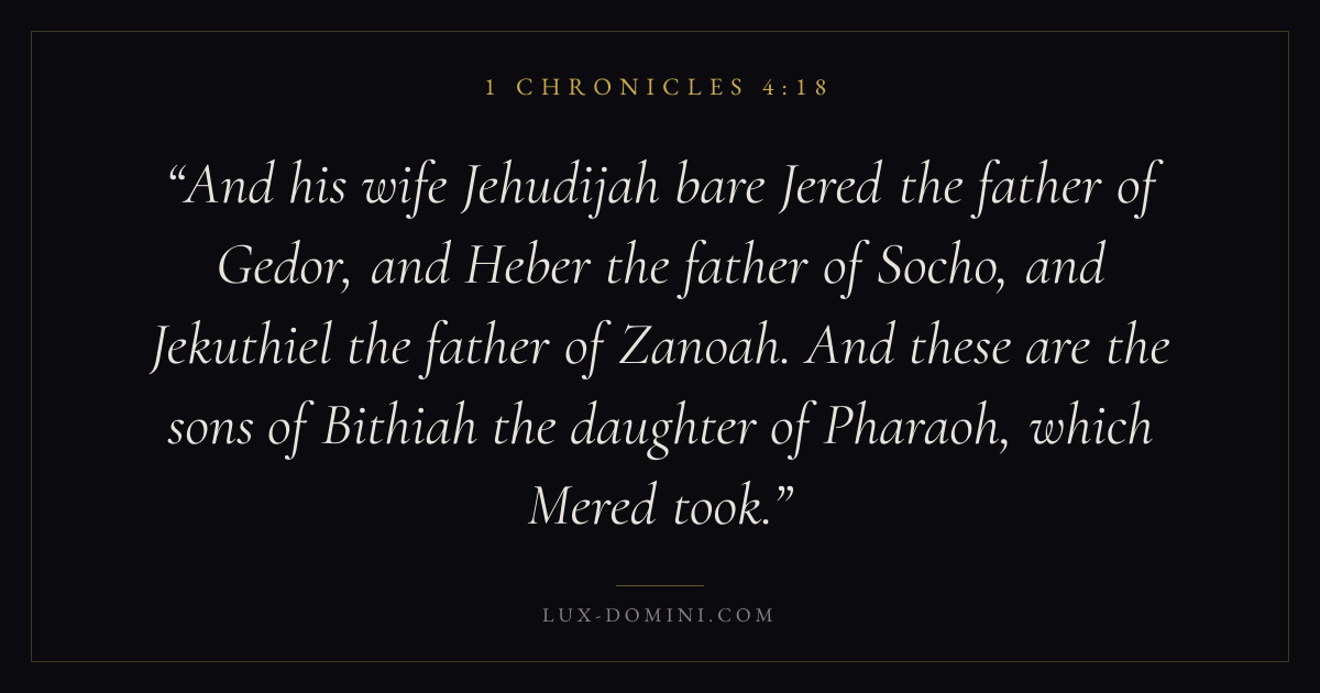 And his wife Jehudijah bare Jered the father of Gedor, and Heber the father of Socho, and Jekuthiel the father of Zanoah. And these are the sons of Bithiah the daughter of Pharaoh, which Mered took.