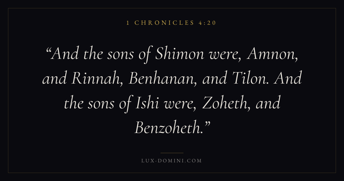 And the sons of Shimon were, Amnon, and Rinnah, Benhanan, and Tilon. And the sons of Ishi were, Zoheth, and Benzoheth.