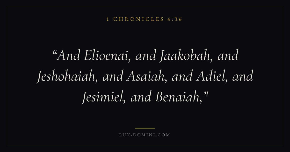 And Elioenai, and Jaakobah, and Jeshohaiah, and Asaiah, and Adiel, and Jesimiel, and Benaiah,