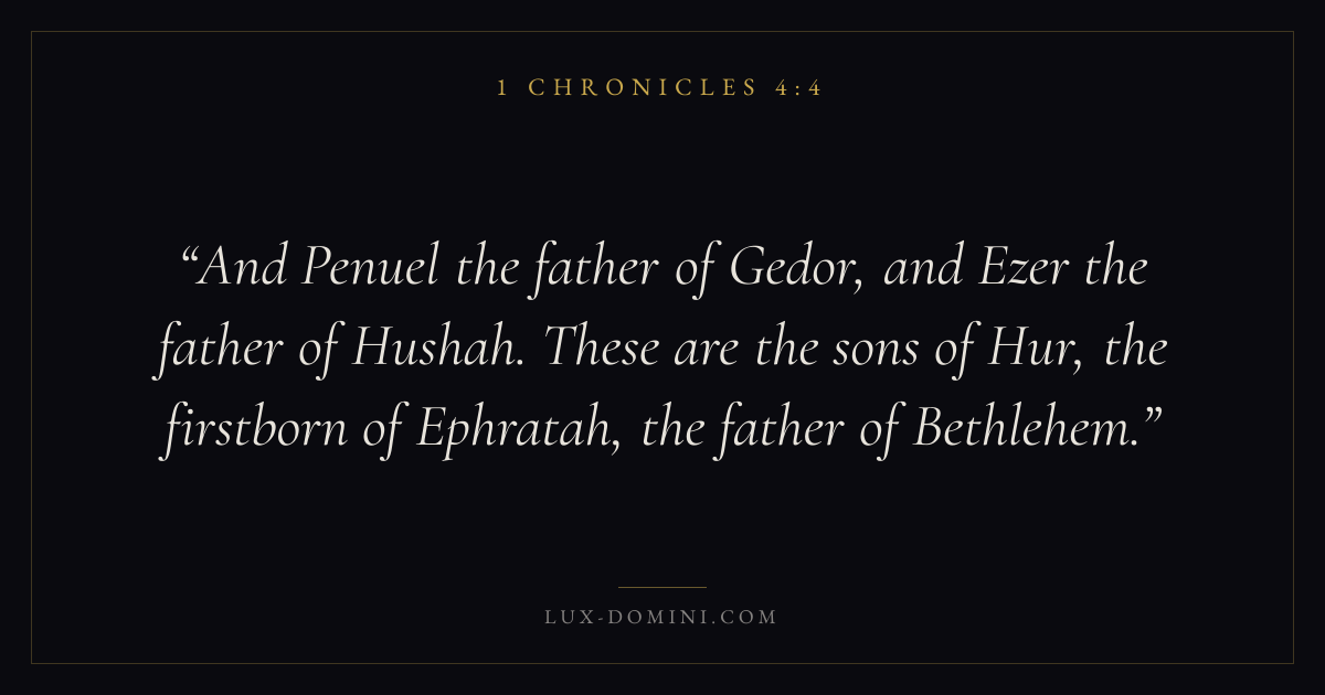 And Penuel the father of Gedor, and Ezer the father of Hushah. These are the sons of Hur, the firstborn of Ephratah, the father of Bethlehem.