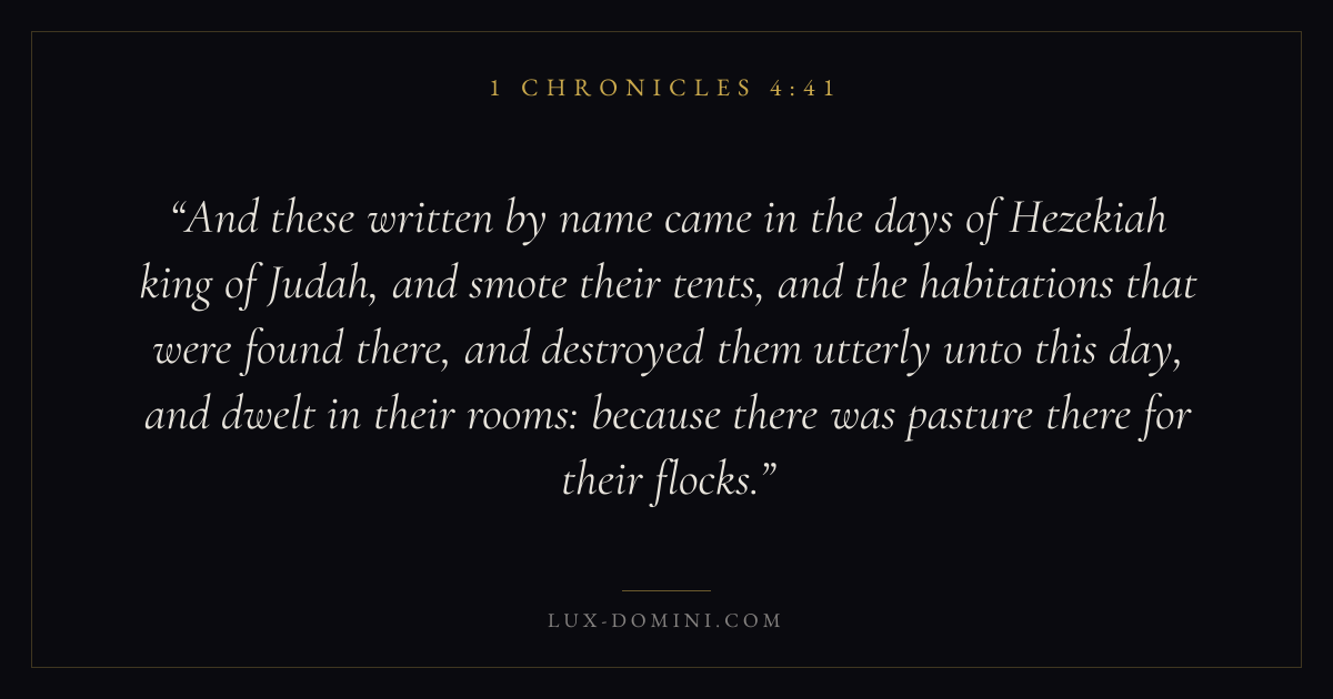 And these written by name came in the days of Hezekiah king of Judah, and smote their tents, and the habitations that were found there, and destroyed them utterly unto this day, and dwelt in their rooms: because there was pasture there for their flocks.