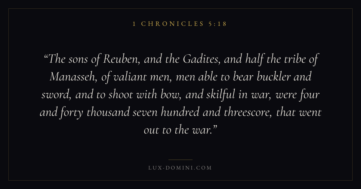 The sons of Reuben, and the Gadites, and half the tribe of Manasseh, of valiant men, men able to bear buckler and sword, and to shoot with bow, and skilful in war, were four and forty thousand seven hundred and threescore, that went out to the war.