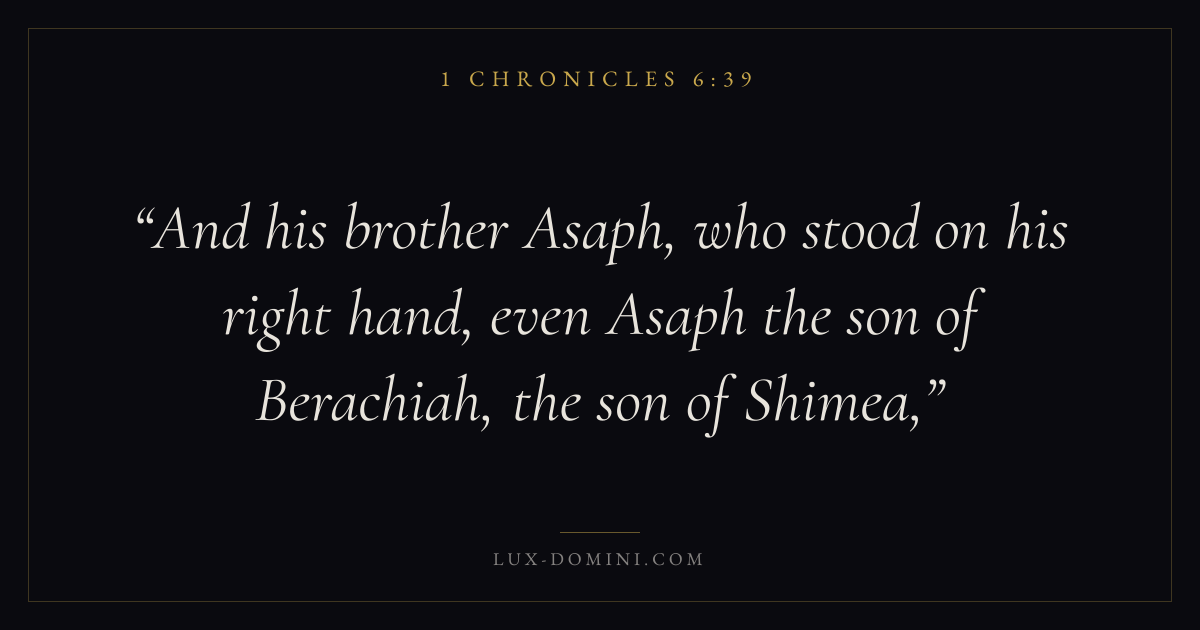 And his brother Asaph, who stood on his right hand, even Asaph the son of Berachiah, the son of Shimea,