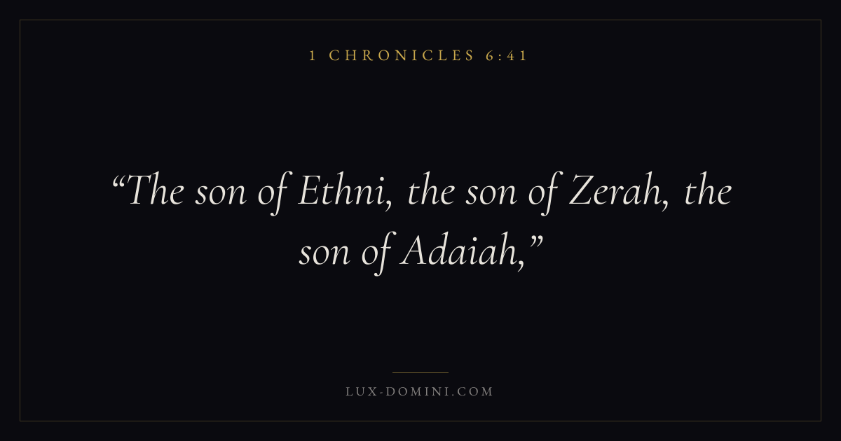 Books / 1 Chronicles / Chapter 6 / Verse 41 ← 1 Chronicles 6:40 1 Chronicles 6:41 1 Chronicles 6:42 → The son of Ethni, the son of Zerah, the son of Adaiah, Download verse card Share on Twitter Share on Facebook Pin it ✦ Key themes MemoryWorshipGenealogyDavid Read with 1 Chronicles 6:421 Chronicles 6:43 Related topics Bible verses about worship ✦ 1 Chronicles Chapter 6 verses V. 1 V. 2 V. 3 V. 4 V. 5 V. 6 V. 7 V. 8 V. 9 V. 10 V. 11 V. 12 V. 13 V. 14 V. 15 V. 16 V. 17 V. 18 V. 19 V. 20 V. 21 V. 22 V. 23 V. 24 V. 25 V. 26 V. 27 V. 28 V. 29 V. 30 V. 31 V. 32 V. 33 V. 34 V. 35 V. 36 V. 37 V. 38 V. 39 V. 40 V. 41 V. 42 V. 43 V. 44 V. 45 V. 46 V. 47 V. 48 V. 49 V. 50 V. 51 V. 52 V. 53 V. 54 V. 55 V. 56 V. 57 V. 58 V. 59 V. 60 V. 61 V. 62 V. 63 V. 64 V. 65 V. 66 V. 67 V. 68 V. 69 V. 70 V. 71 V. 72 V. 73 V. 74 V. 75 V. 76 V. 77 V. 78 V. 79 V. 80 V. 81