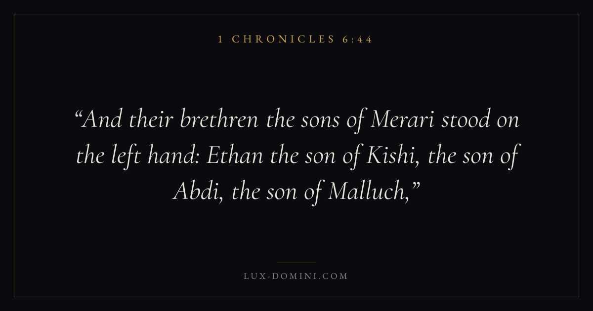 And their brethren the sons of Merari stood on the left hand: Ethan the son of Kishi, the son of Abdi, the son of Malluch,