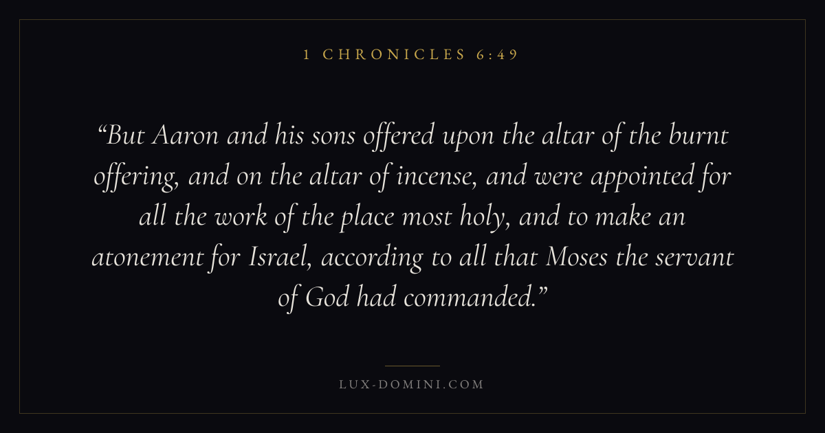 But Aaron and his sons offered upon the altar of the burnt offering, and on the altar of incense, and were appointed for all the work of the place most holy, and to make an atonement for Israel, according to all that Moses the servant of God had commanded.