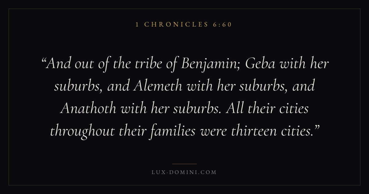 And out of the tribe of Benjamin; Geba with her suburbs, and Alemeth with her suburbs, and Anathoth with her suburbs. All their cities throughout their families were thirteen cities.