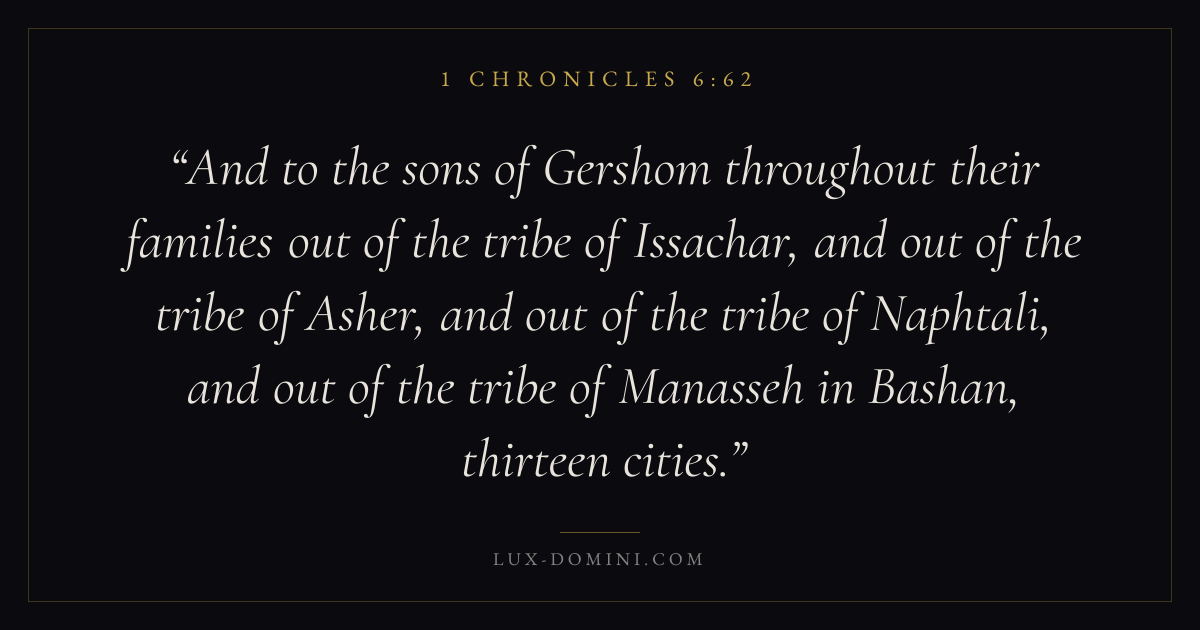 And to the sons of Gershom throughout their families out of the tribe of Issachar, and out of the tribe of Asher, and out of the tribe of Naphtali, and out of the tribe of Manasseh in Bashan, thirteen cities.
