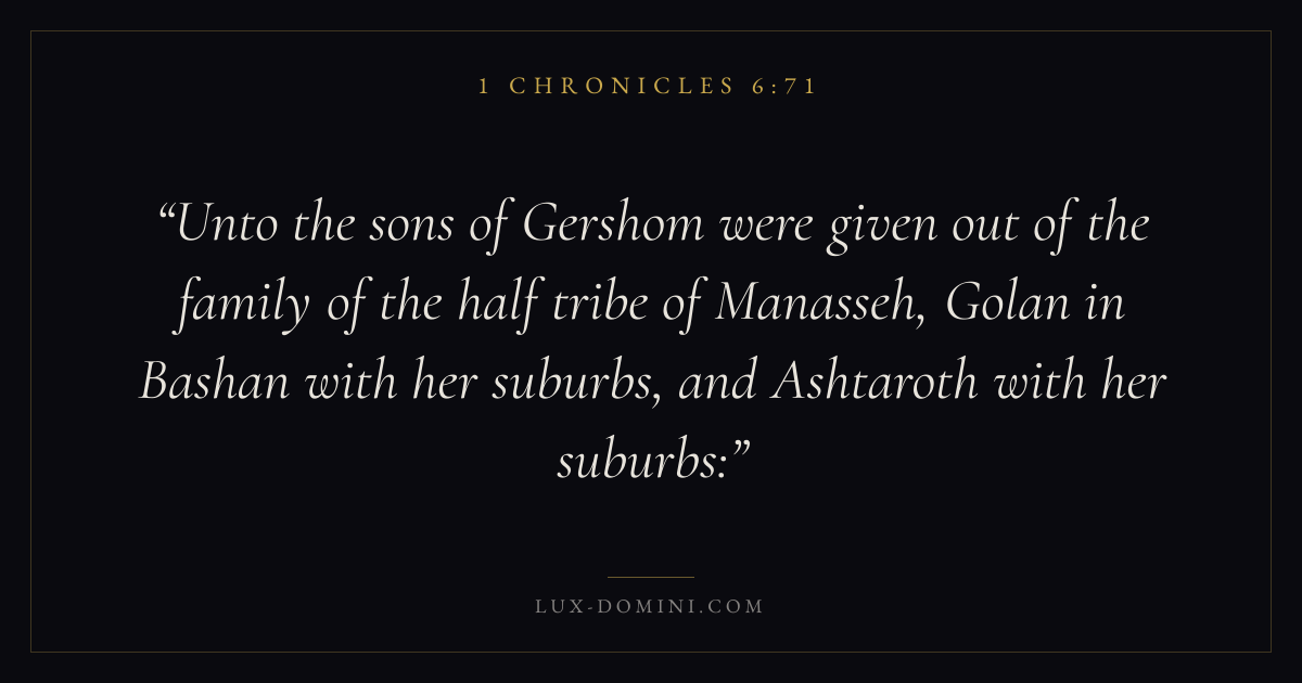Unto the sons of Gershom were given out of the family of the half tribe of Manasseh, Golan in Bashan with her suburbs, and Ashtaroth with her suburbs: