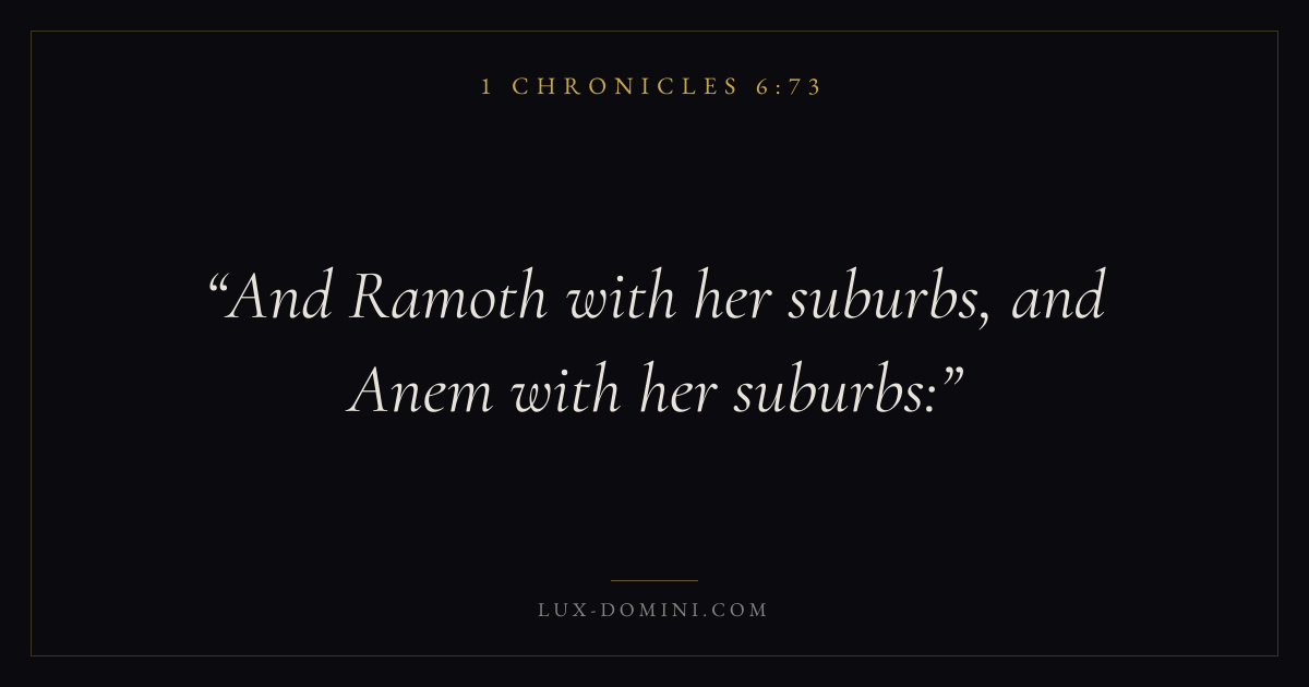 Books / 1 Chronicles / Chapter 6 / Verse 73 ← 1 Chronicles 6:72 1 Chronicles 6:73 1 Chronicles 6:74 → And Ramoth with her suburbs, and Anem with her suburbs: Download verse card Share on Twitter Share on Facebook Pin it ✦ Key themes MemoryWorshipGenealogyDavid Read with 1 Chronicles 6:711 Chronicles 6:72 Related topics Bible verses about worship Glossary Anem Place Biblical settlement. Modern identification: Khirbet Anim. Ramoth Place Biblical settlement. Modern identification: Kokab el Hawa. ✦ 1 Chronicles Chapter 6 verses V. 1 V. 2 V. 3 V. 4 V. 5 V. 6 V. 7 V. 8 V. 9 V. 10 V. 11 V. 12 V. 13 V. 14 V. 15 V. 16 V. 17 V. 18 V. 19 V. 20 V. 21 V. 22 V. 23 V. 24 V. 25 V. 26 V. 27 V. 28 V. 29 V. 30 V. 31 V. 32 V. 33 V. 34 V. 35 V. 36 V. 37 V. 38 V. 39 V. 40 V. 41 V. 42 V. 43 V. 44 V. 45 V. 46 V. 47 V. 48 V. 49 V. 50 V. 51 V. 52 V. 53 V. 54 V. 55 V. 56 V. 57 V. 58 V. 59 V. 60 V. 61 V. 62 V. 63 V. 64 V. 65 V. 66 V. 67 V. 68 V. 69 V. 70 V. 71 V. 72 V. 73 V. 74 V. 75 V. 76 V. 77 V. 78 V. 79 V. 80 V. 81