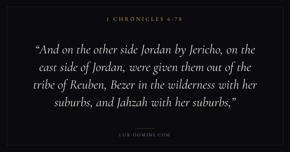 And on the other side Jordan by Jericho, on the east side of Jordan, were given them out of the tribe of Reuben, Bezer in the wilderness with her suburbs, and Jahzah with her suburbs,