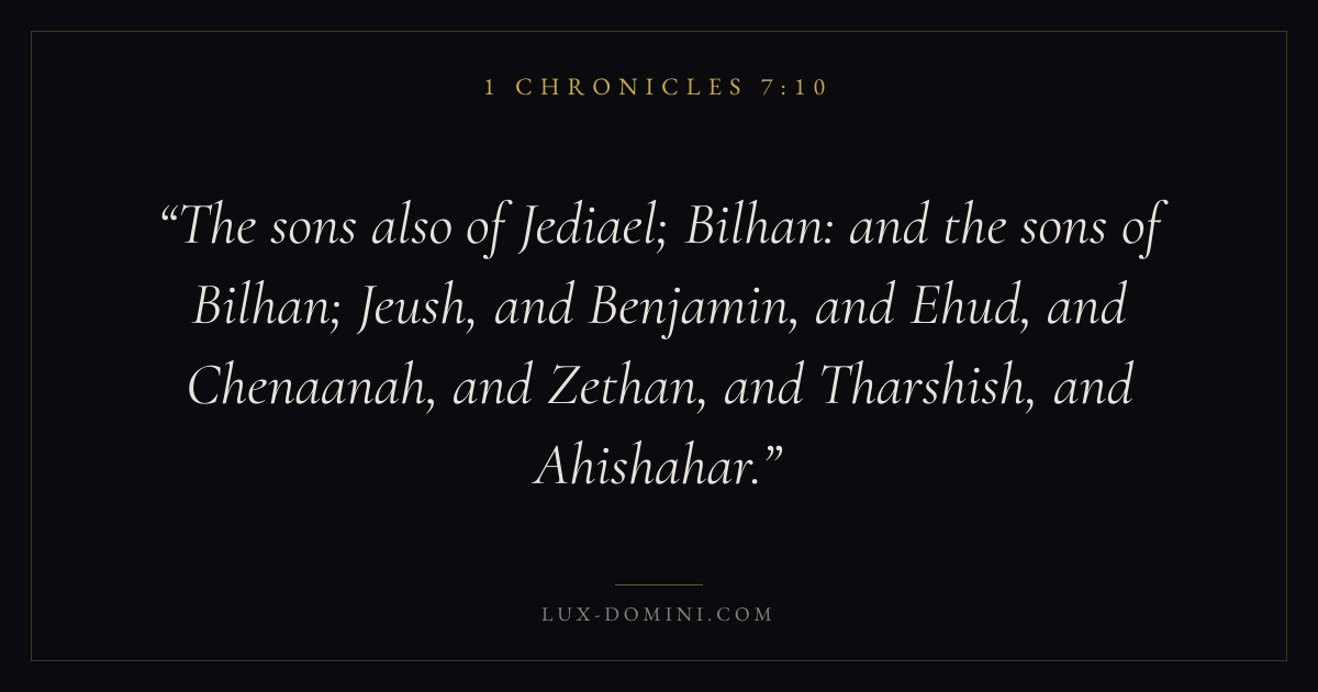 The sons also of Jediael; Bilhan: and the sons of Bilhan; Jeush, and Benjamin, and Ehud, and Chenaanah, and Zethan, and Tharshish, and Ahishahar.