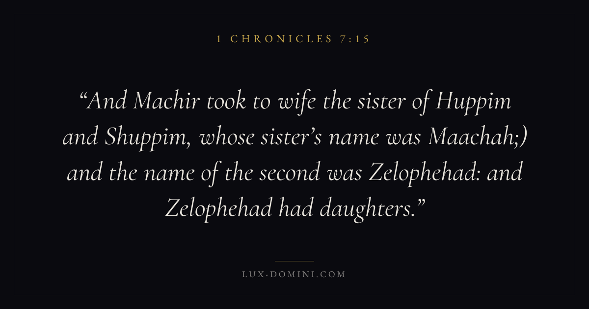 And Machir took to wife the sister of Huppim and Shuppim, whose sister’s name was Maachah;) and the name of the second was Zelophehad: and Zelophehad had daughters.