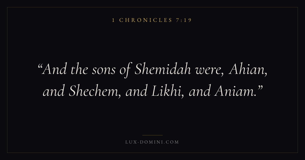 Books / 1 Chronicles / Chapter 7 / Verse 19 ← 1 Chronicles 7:18 1 Chronicles 7:19 1 Chronicles 7:20 → And the sons of Shemidah were, Ahian, and Shechem, and Likhi, and Aniam. Download verse card Share on Twitter Share on Facebook Pin it ✦ Key themes MemoryWorshipGenealogyDavid Related topics Bible verses about worship ✦ 1 Chronicles Chapter 7 verses V. 1 V. 2 V. 3 V. 4 V. 5 V. 6 V. 7 V. 8 V. 9 V. 10 V. 11 V. 12 V. 13 V. 14 V. 15 V. 16 V. 17 V. 18 V. 19 V. 20 V. 21 V. 22 V. 23 V. 24 V. 25 V. 26 V. 27 V. 28 V. 29 V. 30 V. 31 V. 32 V. 33 V. 34 V. 35 V. 36 V. 37 V. 38 V. 39 V. 40