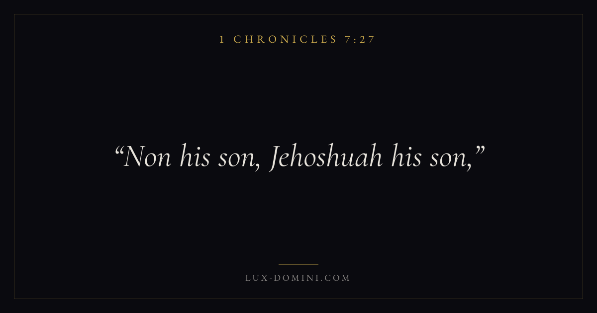 Books / 1 Chronicles / Chapter 7 / Verse 27 ← 1 Chronicles 7:26 1 Chronicles 7:27 1 Chronicles 7:28 → Non his son, Jehoshuah his son, Download verse card Share on Twitter Share on Facebook Pin it ✦ Key themes MemoryWorshipGenealogyDavid Read with 1 Chronicles 7:231 Chronicles 7:24 Related topics Bible verses about worship ✦ 1 Chronicles Chapter 7 verses V. 1 V. 2 V. 3 V. 4 V. 5 V. 6 V. 7 V. 8 V. 9 V. 10 V. 11 V. 12 V. 13 V. 14 V. 15 V. 16 V. 17 V. 18 V. 19 V. 20 V. 21 V. 22 V. 23 V. 24 V. 25 V. 26 V. 27 V. 28 V. 29 V. 30 V. 31 V. 32 V. 33 V. 34 V. 35 V. 36 V. 37 V. 38 V. 39 V. 40