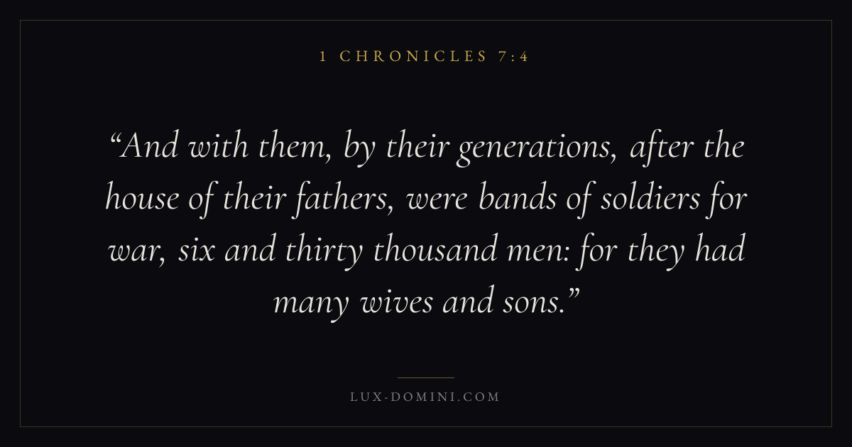 And with them, by their generations, after the house of their fathers, were bands of soldiers for war, six and thirty thousand men: for they had many wives and sons.