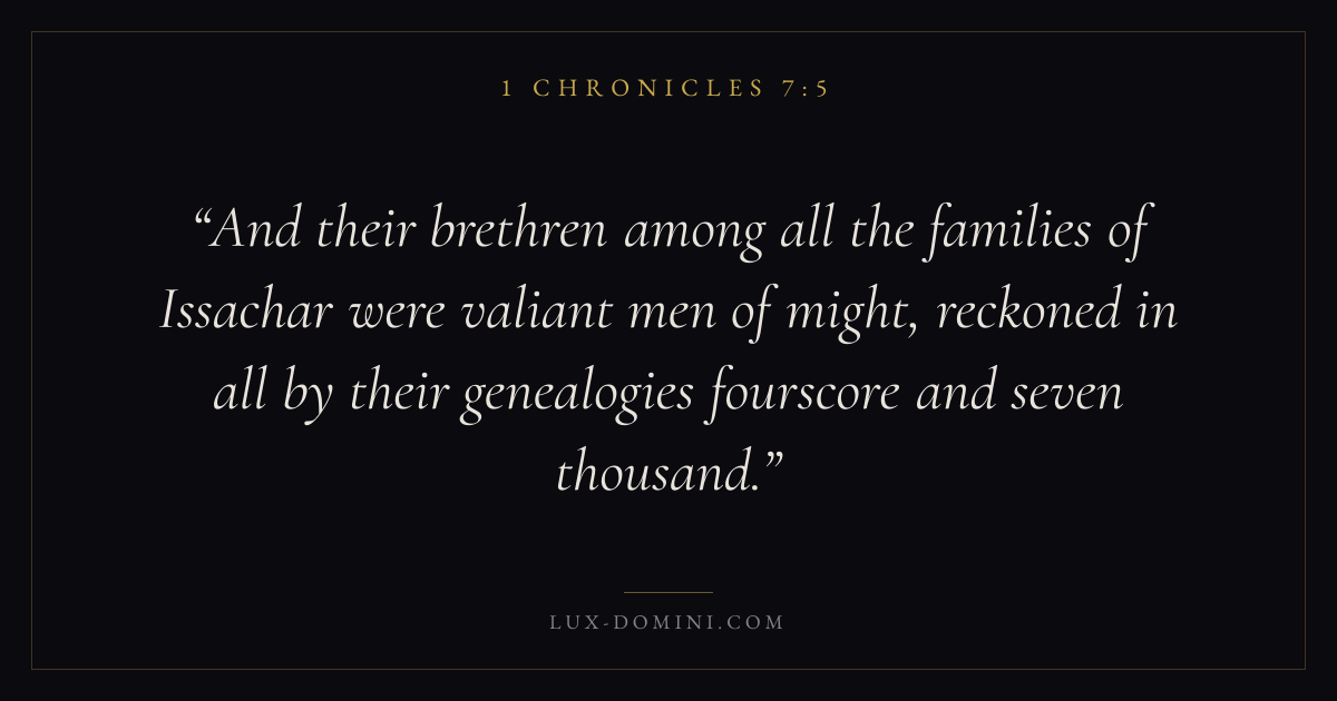 And their brethren among all the families of Issachar were valiant men of might, reckoned in all by their genealogies fourscore and seven thousand.