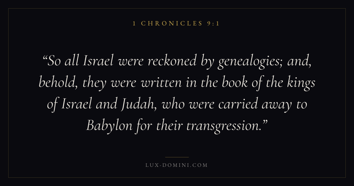 So all Israel were reckoned by genealogies; and, behold, they were written in the book of the kings of Israel and Judah, who were carried away to Babylon for their transgression.