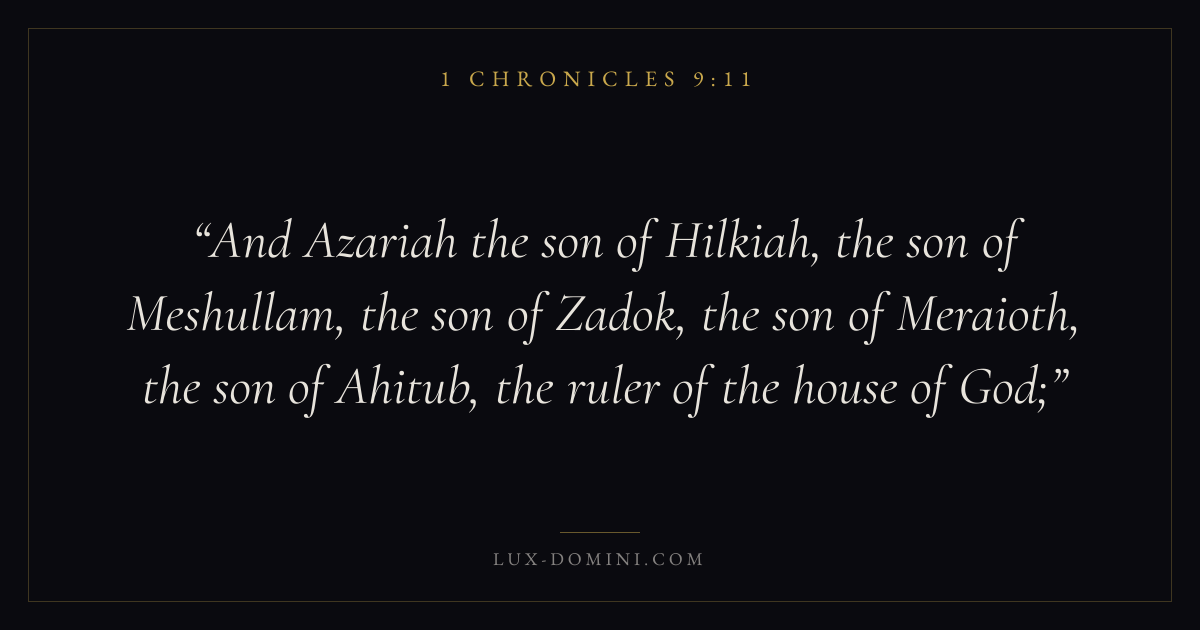 And Azariah the son of Hilkiah, the son of Meshullam, the son of Zadok, the son of Meraioth, the son of Ahitub, the ruler of the house of God;
