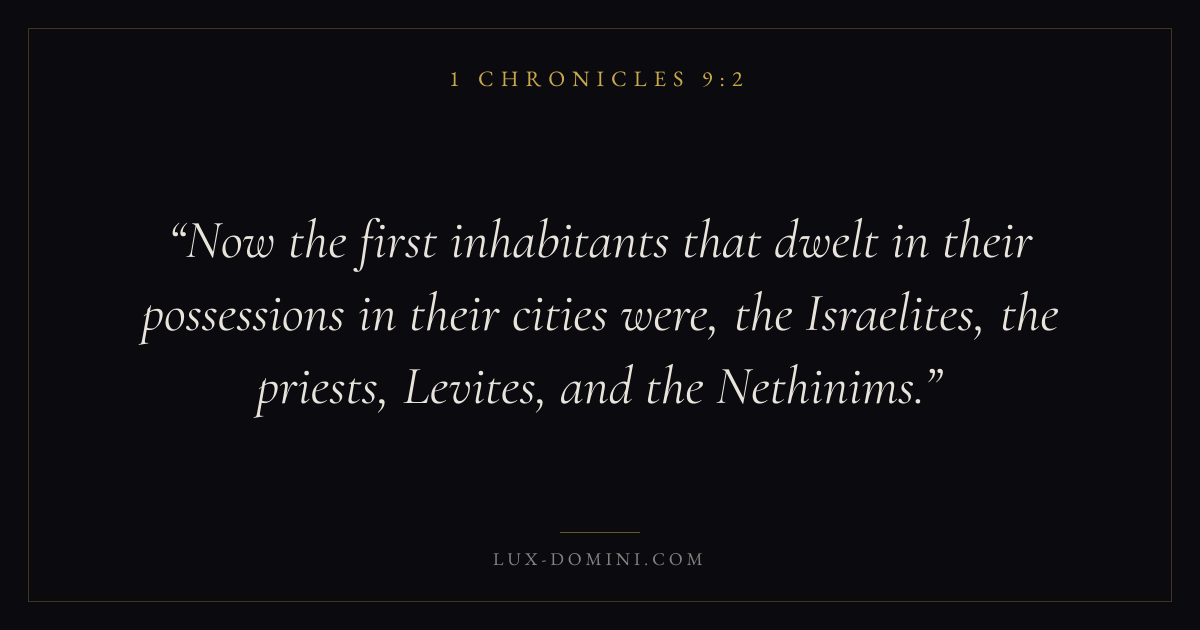 Now the first inhabitants that dwelt in their possessions in their cities were, the Israelites, the priests, Levites, and the Nethinims.