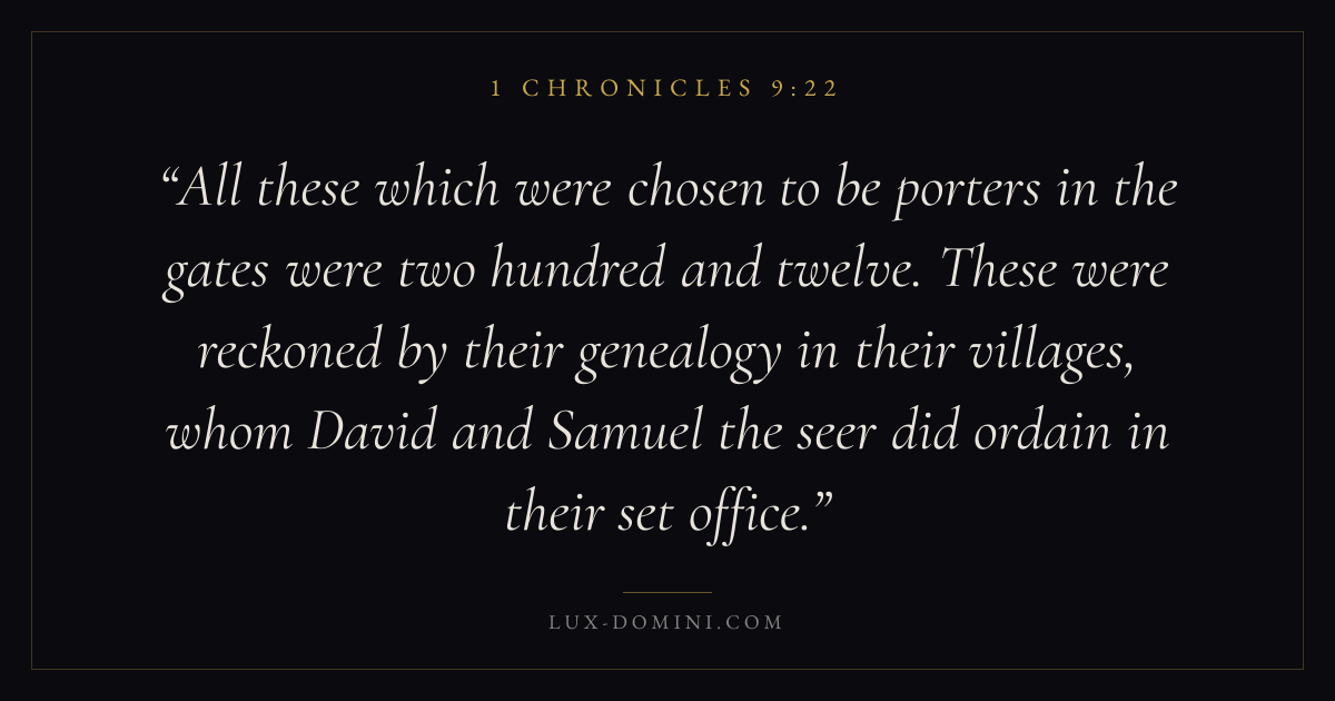 All these which were chosen to be porters in the gates were two hundred and twelve. These were reckoned by their genealogy in their villages, whom David and Samuel the seer did ordain in their set office.