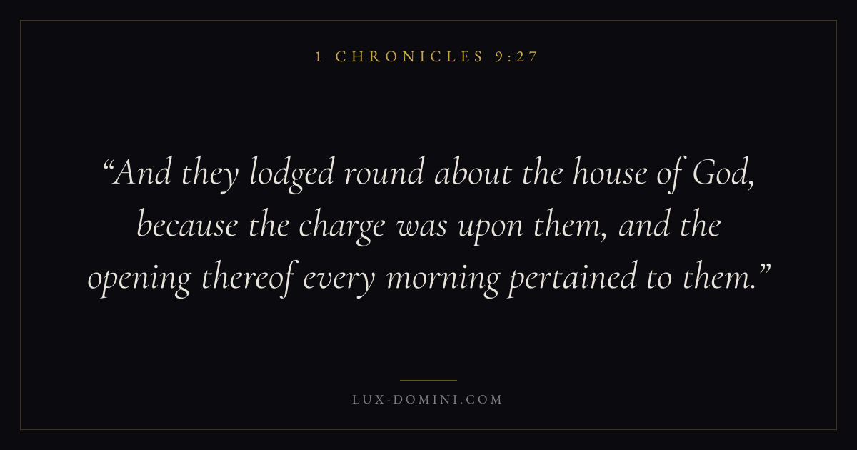 And they lodged round about the house of God, because the charge was upon them, and the opening thereof every morning pertained to them.