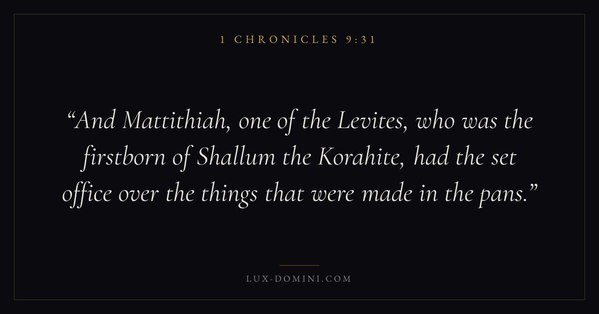 And Mattithiah, one of the Levites, who was the firstborn of Shallum the Korahite, had the set office over the things that were made in the pans.