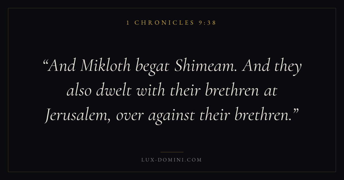 And Mikloth begat Shimeam. And they also dwelt with their brethren at Jerusalem, over against their brethren.